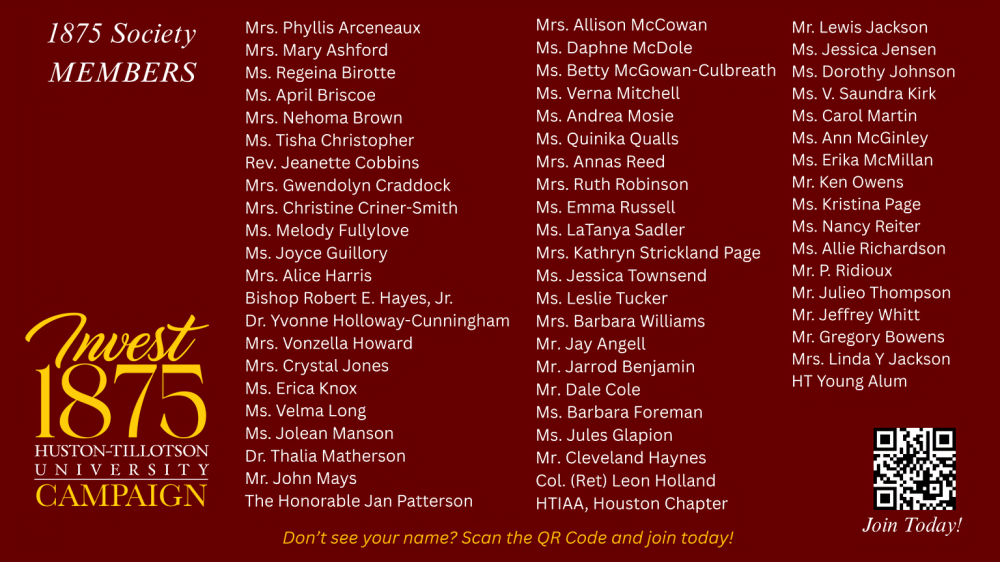 Huston-Tillotson University launched the 1875 Society in celebration of its 150th anniversary. Be among the first to join by donating any increment or recurring donation. Click the donate button below to start your giving to HTU 1875 Soeciety. Thank you. Call 512.505.3110 for more information.