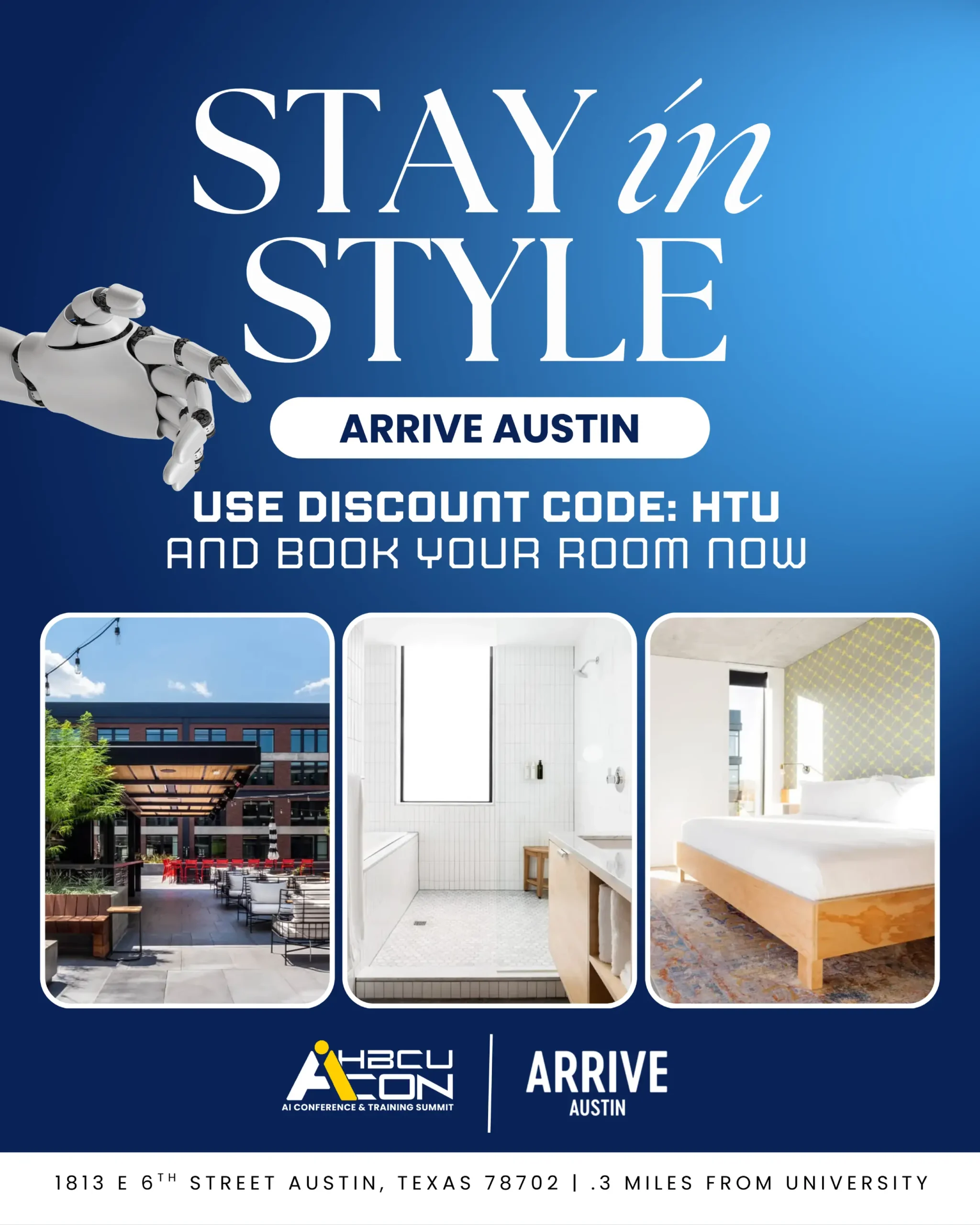 Enjoy a comfortable and convenient stay during HBCU AiCon 2026 at ARRIVE Austin, a modern 4-star hotel just 0.3 miles (an 8-minute walk) from Huston-Tillotson University.