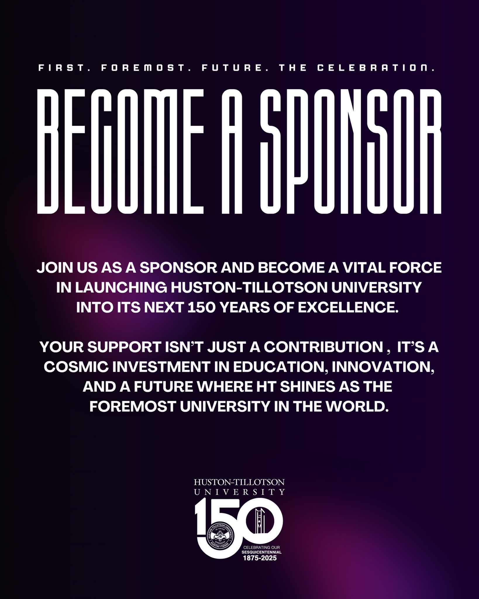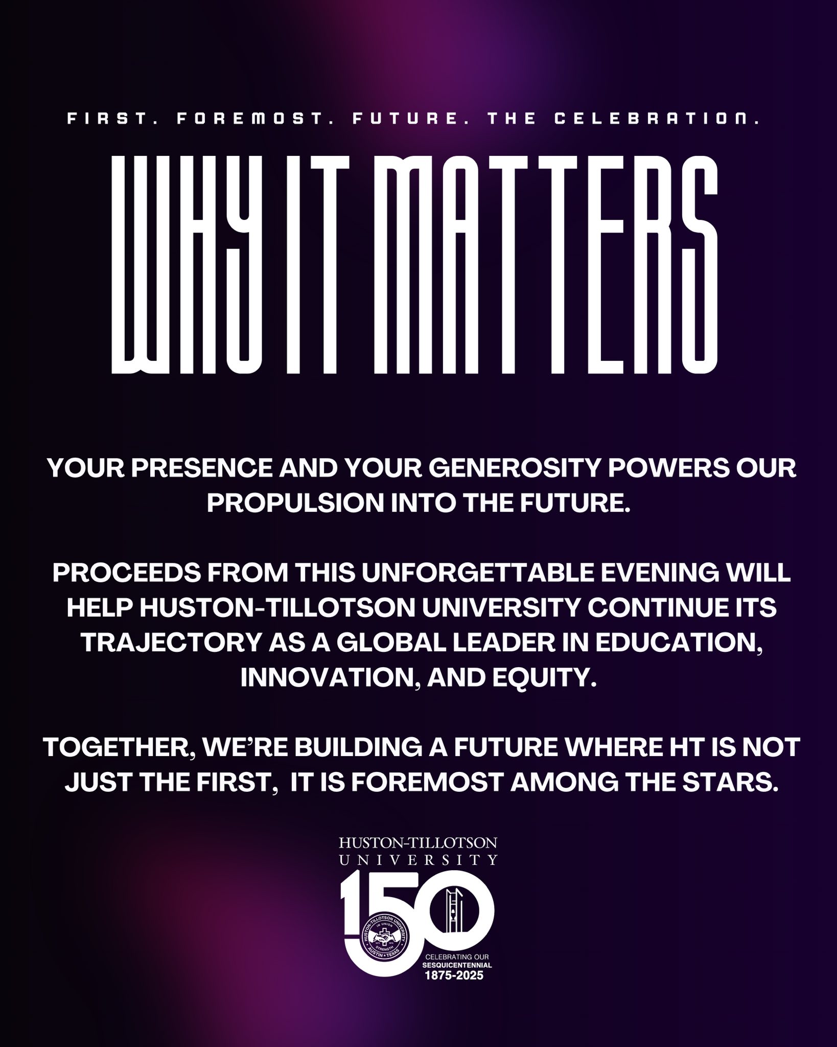 With the theme “First. Foremost. Future: The Celebration,” this dazzling event will honor HT’s powerful legacy as the first institution of higher education in Austin and the third oldest business in the city, while igniting a bold new era of innovation and impact.