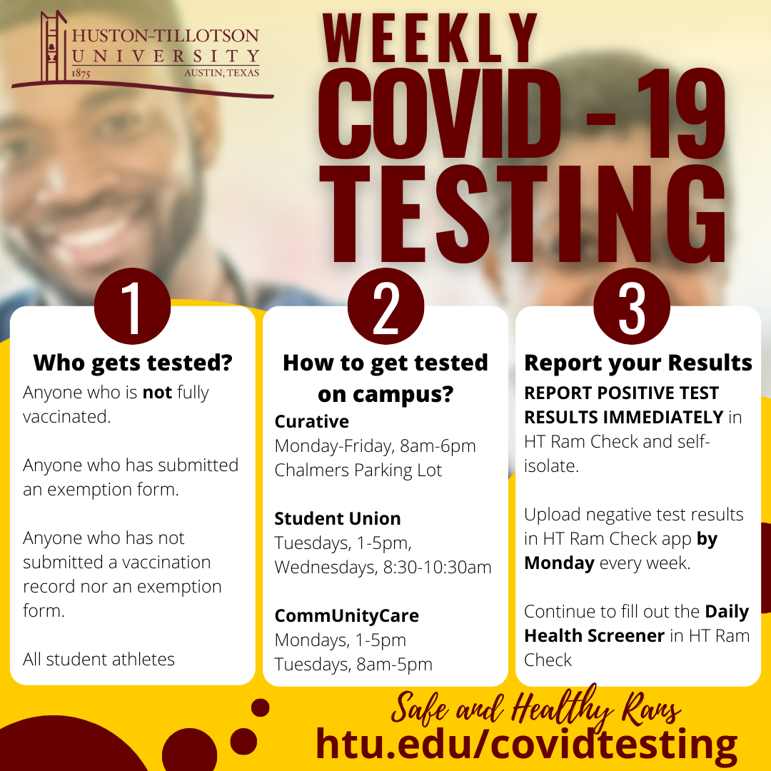 Per our campus reactivation protocols, all students and employees who are not fully vaccinated will undergo routine weekly COVID-19 PCR-based testing. A negative PCR test result must be uploaded into the HT Ram Check app by Sunday night each week to remain cleared for campus.